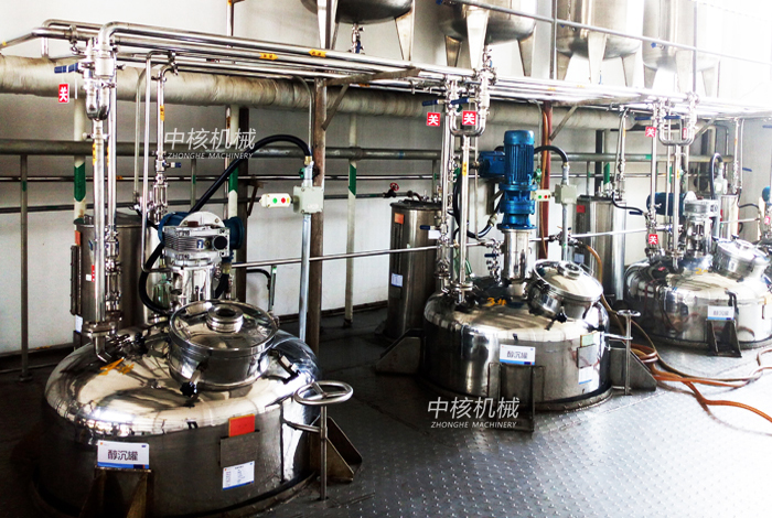 中药水煎浓缩液(一般比重为1.2左右),去除非醇溶性的淀粉、蛋白质等,采用加入酒精配成一定醇度的液体,然后常温最好是低温冷冻沉降进行固液分离以提高中药提取液的纯度及澄明度,从而提高产品质量。浓缩液和酒精按工艺要求,投入各自的配比量并开启冷冻盐水或冷却水,搅拌混和均匀,达到料液所需的温度后停止搅拌,继续在夹套内通入冷冻盐水或冷却水,保证所需的液温。待沉淀完成后开启上清液出料阀放料。