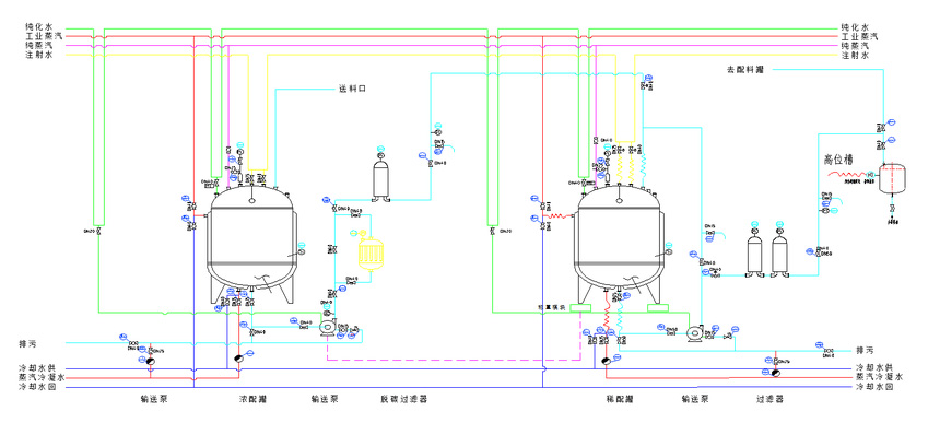 大输液小针剂配液系统是制药行业一条常见的生产线,主要设备有浓配罐、药液泵、浓配过滤器、稀配罐、药液泵、稀配过滤器等组成。大输液小针剂配液生产线适用于制药行业的浓稀配液之用,罐体设置夹套,可加热和冷却,内表面镜面抛光,管口拉拔,卫生无死角,符合GMP标准。由于对灭菌的要求,因此浓配罐、稀配罐均有在线清洗和在线灭菌功能,卫生,配液均匀,准确。全自动的配置称重模块,配液精准,效率高,安全可靠。